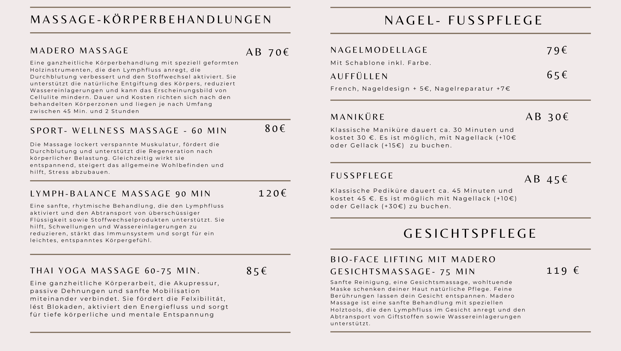- unterschiedliche Arten von Massage (Madero-Massage, Sport-Massage, Wellness-Massage, Thai-Yoga Massage)